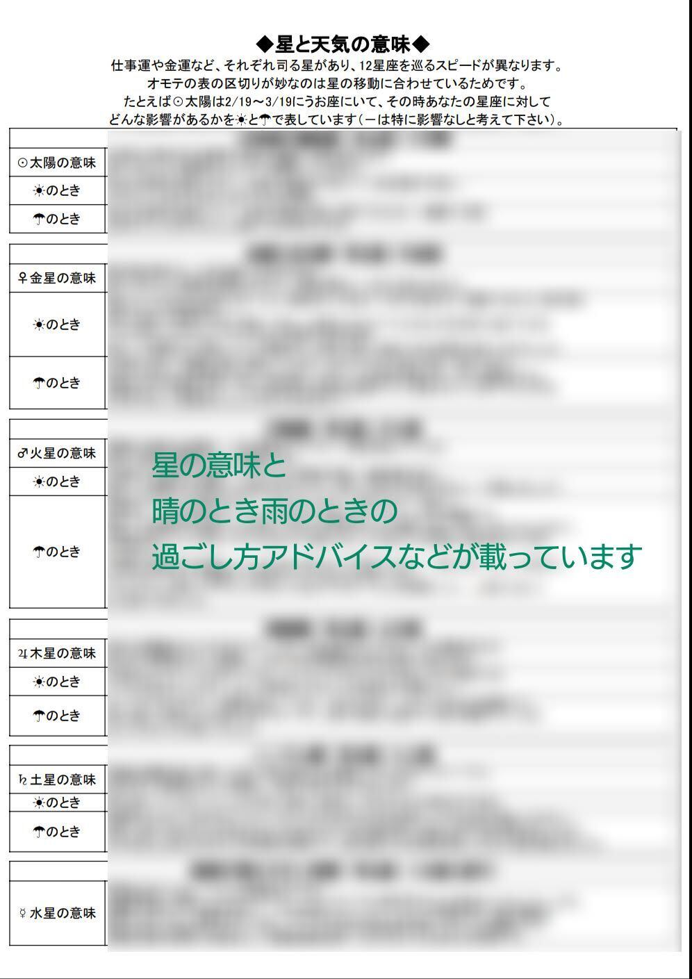 ◆2枚目:星のもつ意味、晴のとき・雨のときの過ごし方のアドバイスが載っています。